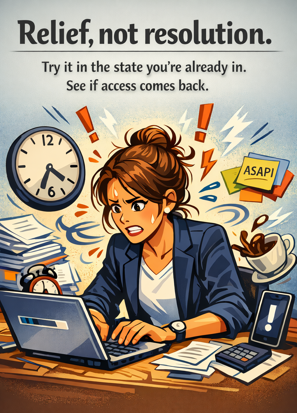 It's designed for real conditions: depleted afternoons, wired-tired evenings, and days when calm advice doesn't apply. You don't have to explain yourself, believe in anything, or commit to a system. You just try it once, in the state you're already in, and see whether access comes back - even a little.
